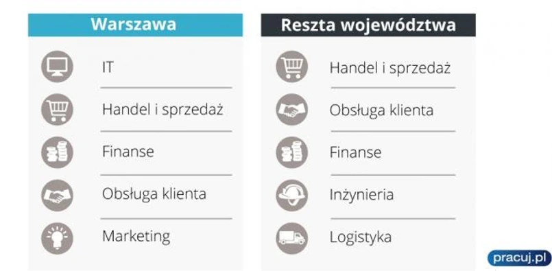 Warszawa i aglomeracja warszawska dominują na regionalnym rynku pracy pod każdym względem – na tym obszarze jest najwięcej ofert pracy i największe ich zróżnicowanie. Osoby mieszkające w pozostałych miastach Mazowsza mają mniejszy wybór, gdyż pracę można tam znaleźć głównie w sektorach strategicznych w skali lokalnej. Na przykład, podwarszawskie Błonie czy Grodzisk Mazowiecki oferują najwięcej pracy w branży logistycznej ze względu na znajdujące się tam centra logistyczne.