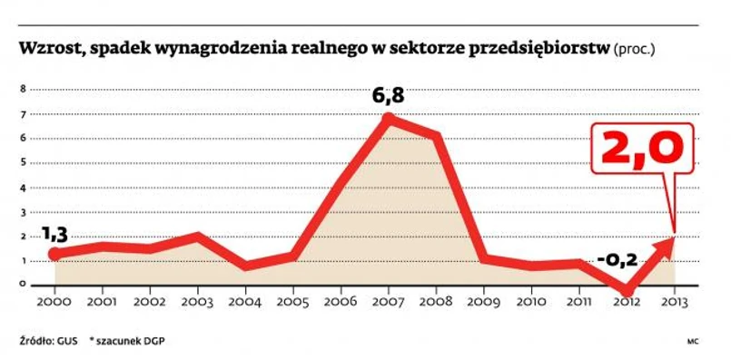Także dlatego zarobki rosną jedynie nieznacznie. Według GUS w grudniu przeciętne wynagrodzenie w przedsiębiorstwach zatrudniających ponad dziewięć osób wyniosło 4222 złote. Było więc o 2,7 proc. wyższe niż przed rokiem. Podwyżki pensji nie były wysokie, ponieważ utrzymywało się duże bezrobocie, co powstrzymywało pracowników od upominania się o nie. Mimo to w ubiegłym roku zanotowaliśmy realny wzrost wynagrodzeń o 2 proc. To zasługa niskiej, zaledwie 0,9-proc. inflacji. Tymczasem jeszcze w 2012 r. siła nabywcza naszych pensji spadła o 0,2 proc. – po 20 latach wzrostu.
