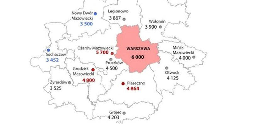 Najniższe przeciętne miesięczne wynagrodzenia brutto otrzymywały osoby pracujące w Wyszkowie (3 400 PLN), Sochaczewie (3452 PLN) oraz w miejscowości Nowy Dwór Mazowiecki (3 500 PLN). Ponad 1 000 PLN więcej zarabiali mieszkańcy Grodziska Mazowieckiego (4 800 PLN) oraz Piaseczna (4864 PLN). W Ożarowie Mazowieckim przeciętne wynagrodzenie wyniosło 5 700 PLN. To miasto, razem z Grodziskiem Mazowieckim oraz Piasecznem, znajduje się w grupie o najwyższych zarobkach. Pod względem wysokości wynagrodzeń niezmiennie króluje Warszawa. W stolicy przeciętne miesięczne wynagrodzenie w 2013 roku ukształtowało się na poziomie 6 000 PLN.