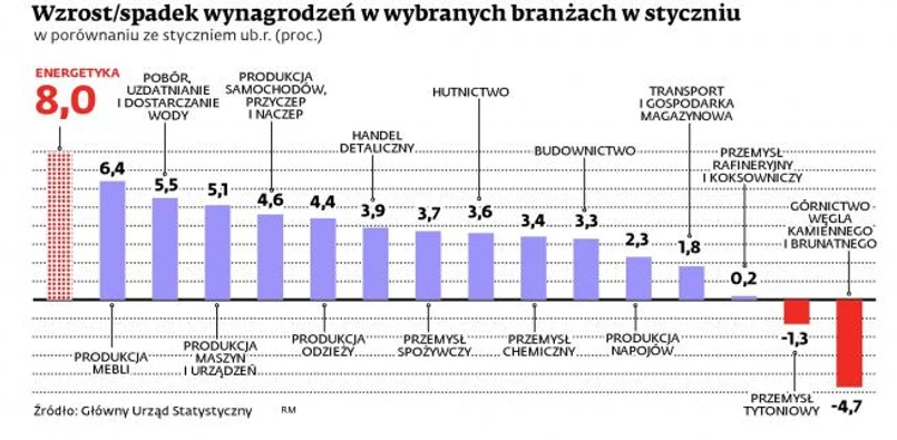 Przeciętne wynagrodzenie w sektorze przedsiębiorstw wyniosło w styczniu 3805 zł i było o 3,4 proc. wyższe niż przed rokiem – podał GUS. Wzrost zarobków nie był duży. Na tym tle wyróżniają się płace w energetyce, która skupia firmy zajmujące się wytwarzaniem i zaopatrywaniem odbiorców w energię elektryczną, gaz, parę wodną i gorącą wodę. W tej branży przeciętne wynagrodzenie wyniosło w styczniu 6149 zł i było o 8 proc. wyższe niż przed rokiem. Te dość duże podwyżki nie mogą dziwić. Firmy te wypracowały w ubiegłym roku bardzo dobre wyniki finansowe – po trzech kwartałach zarobiły na czysto prawie 16,2 mld zł i było to aż o 43 proc. więcej niż w tym samym okresie roku poprzedniego. Podwyżki znacznie większe od średnich otrzymali także pracownicy w przemyśle meblarskim. Ich pensje wzrosły w skali roku o 6,4 proc. – Poprawił się wynik finansowy tej branży przy malejącym zatrudnieniu – twierdzi Tomasz Wiktorski, właściciel firmy B+R Studio. Dodaje, że po raz pierwszy od dłuższego czasu zmniejszyła się liczba przedsiębiorstw meblowych. Po części był to efekt łączenia się firm i likwidacji słabych podmiotów. – Pozostały na rynku te, które lepiej płacą i które stać było na podwyżki – wyjaśnia Wiktorski. Jednak przeciętna pensja w tej branży wciąż należy do najniższych w sektorze przedsiębiorstw – w styczniu wyniosła 2895 zł.
