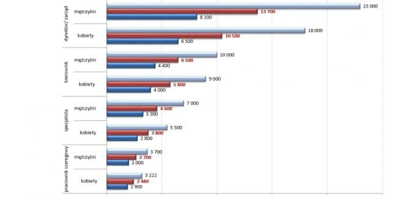 Największe różnice między wynagrodzeniami kobiet i mężczyzn zaobserwowano na szczeblu dyrektora/zarządu. Kobiety zarabiały przeciętnie o 3 200 PLN mniej. Połowa mężczyzn zatrudnionych na stanowisku kierownika zarabiała od 4 400 PLN do 10 000 PLN. Kobiety otrzymywały pensję na poziomie 5 800 PLN.