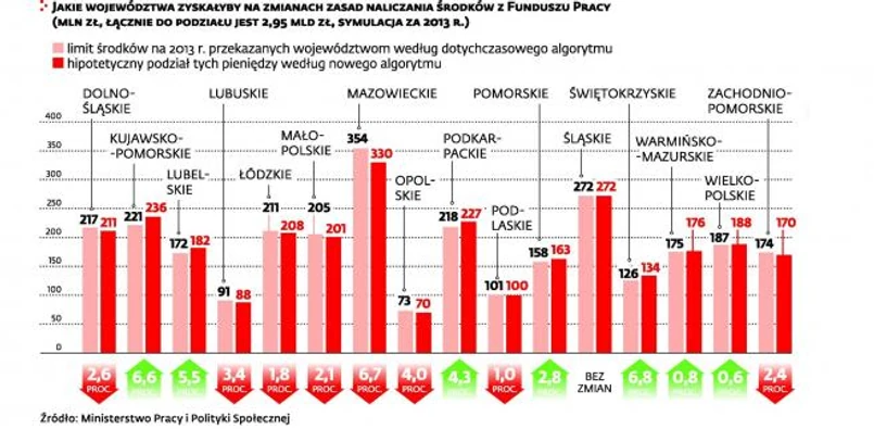 Już w przyszłym roku urzędy pracy, które znajdują zatrudnienie bezrobotnym, dostaną więcej środków na ich aktywizację. Te, które działają nieefektywnie, otrzymają ich mniej. Zgodnie z przedstawioną przez Ministerstwo Pracy i Polityki Społecznej symulacją na 2013 r. na zmianie zasad podziału pieniędzy zyskałyby województwo świętokrzyskie (8,5 mln zł) czy kujawsko-pomorskie (14,5 mln zł), a straciłoby mazowieckie (23,7 mln zł).