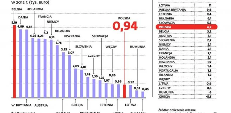Duże różnice w płacach to oprócz wysokiego bezrobocia główny powód fali emigracji Polaków. W efekcie według oficjalnych danych w 2012 r. za granicą przebywało ponad 2,1 mln Polaków. Jeśli w przyszłości różnice w zarobkach będą nadal drastyczne, można oczekiwać, że kolejne grupy rodaków będą opuszczać nasz kraj. Niższe niż w Polsce zarobki w przemyśle poszczególnych krajów Unii Europejskiej występują tylko w Bułgarii, na Łotwie i w Rumunii. Przy tym w Bułgarii są one ponad dwa razy niższe niż nad Wisłą. Przegonili nas za to Węgrzy, Czesi i Słowacy, których przeciętne pensje były przed 14 laty znacznie niższe niż w Polsce. Tymczasem w 2012 r. Czesi zatrudnieni w przemyśle zarabiali o 419 euro więcej.