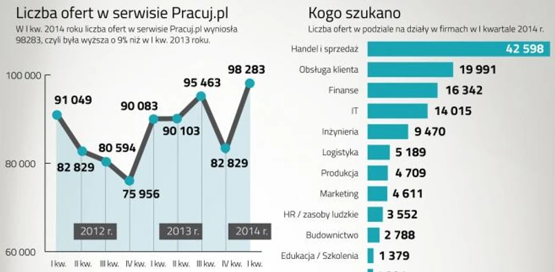 Potwierdzeniem tezy, że firmy dostały nieco wiatru w żagle jest również to, że w analizowanym okresie najbardziej wzrosło zapotrzebowanie na pracowników działów produkcji. Ofert dla tych osób było o 1/5 więcej niż w IV kwartale 2013. W przypadku tej specjalizacji odnotowano podobny przyrost liczby propozycji w ujęciu rocznym, ale jeszcze większy był w działach obsługi klienta i w departamentach HR.