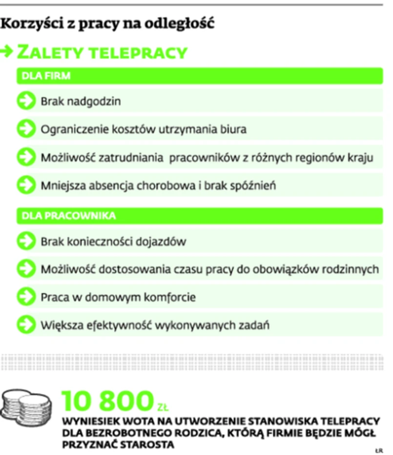 Niechęć pracodawców wynika głównie z niekorzystnych przepisów określających zasady i tryb zatrudniania osób świadczących obowiązki z domu. Tymczasem znowelizowane ostatnio przepisy ustawy z 20 kwietnia 2004 r. o promocji zatrudnienia i instytucjach rynku pracy przewidują grant na utworzenie zdalnego stanowiska pracy dla bezrobotnego rodzica. Chodzi o osobę powracającą na rynek pracy, posiadającą co najmniej jedno dziecko w wieku do 6 lat lub bezrobotnego sprawującego opiekę nad osobą zależną, który w okresie 3 lat przed rejestracją w pośredniaku zrezygnował z pracy zarobkowej z uwagi na konieczność wychowywania dziecka lub opieki nad osobą zależną. Środki w wysokości 6-krotności minimalnego wynagrodzenia będą pochodzić z Funduszu Pracy.