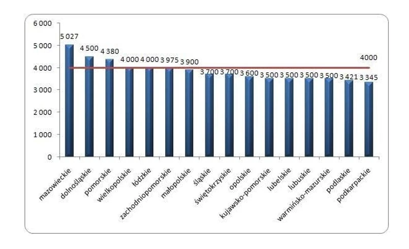 Na najwyższe zarobki mogli liczyć budowlańcy zatrudnieni w woj. mazowieckim. Połowa z nich zarabiała więcej niż 5 027 PLN brutto. Powyżej mediany dla całej branży zarabiali również budowlańcy z województw dolnośląskiego i pomorskiego. Najsłabiej zarabiali zatrudnieni w województwach podlaskim i podkarpackim.