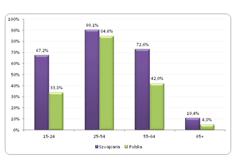 Szwajcaria może pochwalić się również wysokim wskaźnikiem zatrudnienia, który wynosił w 2012 roku nieco ponad 65%, podczas gdy w Polsce było to w tym samym czasie niespełna 51%.