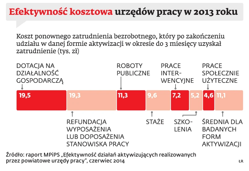 Z ministerialnego raportu wynika, że w 2013 r. w programach aktywizacji wzięło udział blisko 461 tys. osób zarejestrowanych w pośredniakach. Na rynek pracy wróciło 292 tys. osób. Tymczasem w 2013 r. w ewidencjach urzędów figurowało średnio 2,1 mln bezrobotnych. Pracę znalazło więc zaledwie 13,5 proc. spośród tych, którzy korzystali z publicznych służb zatrudnienia.