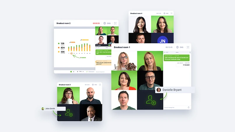 Gospodarz wydarzenia może również przechodzić między podpokojami i wysyłać wiadomości do wszystkich uczestników (pracujących w osobnych grupach). Wszystkie te narzędzia pozwalają na zarządzanie efektywnością uczestników i bezpieczeństwem wydarzeń online.
