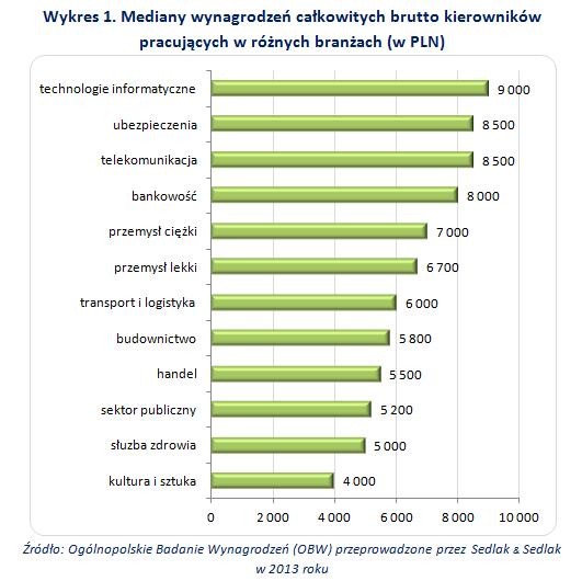 Poza branżą IT najlepsze zarobki otrzymywali kierownicy w telekomunikacji i bankowości. Wśród najsłabiej opłacanych kierowników, poza zatrudnionymi w kulturze i sztuce, znaleźli się pracujący w służbie zdrowia i sektorze publicznym.