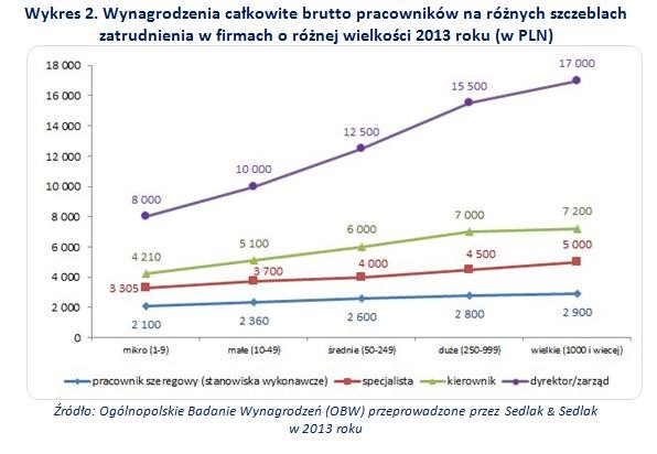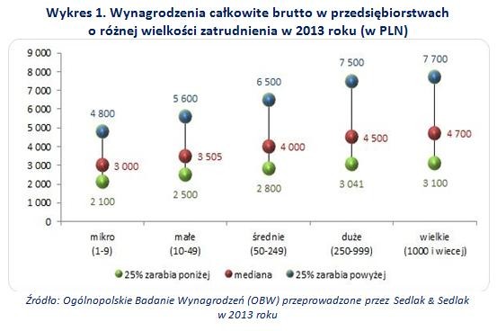 Na przeciwnym biegunie pod względem zarobków znajdowali się pracownicy najmniejszych firm, które zatrudniały do dziewięciu osób włącznie. Mediana płac zatrudnionych tam pracowników wynosiła 3 tys. PLN brutto miesięcznie. Najgorzej wynagradzani nie otrzymywali nawet 2 100 PLN brutto miesięcznie.