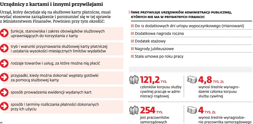 Służbową kartę dostają nie tylko ministrowie, lecz także szeregowi pracownicy. Przyznawanie urzędnikom służbowych kart kredytowych zależy od dobrej woli przełożonego i nie jest szczegółowo kontrolowane. Dlatego szefowie chętnie nimi obdarowują, zwłaszcza w samorządach.