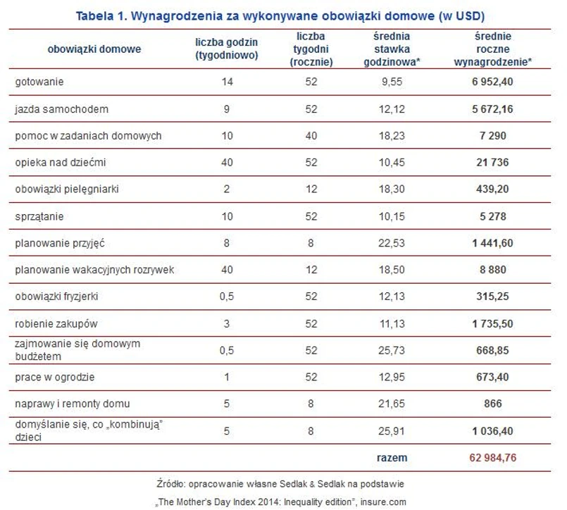 Równie wysokie wynagrodzenie kobieta otrzymałaby za zajmowanie się domowym budżetem, gdyż księgowy i rewident (według Bureau of Labor Statistics) zarabiają 25,73 USD za godzinę. Mama zarobiłaby najwięcej na opiece nad dziećmi – 21 736 USD rocznie, a przeznaczyłaby na tę pracę 2 080 godzin w roku. Dużą ilość czasu pochłania jej również gotowanie, a praca ta warta jest 6 952 USD rocznie.