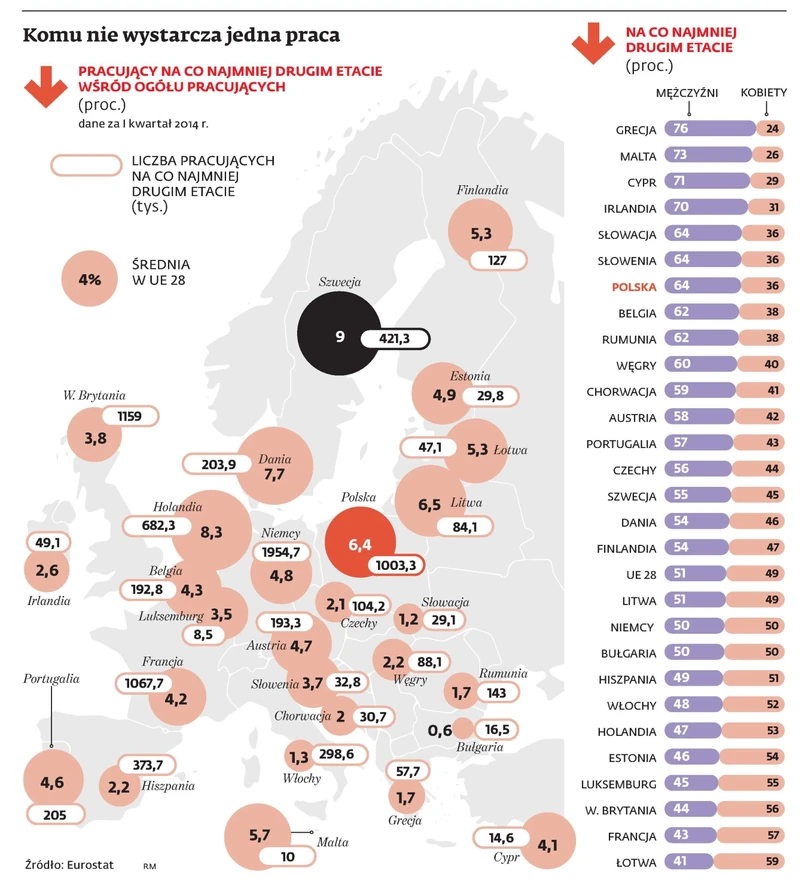 Drugą pracę miało w I kw. 6,4 proc. spośród wszystkich zatrudnionych w Polsce. W krajach unijnych większy odsetek takich pracowników był tylko w Szwecji (9 proc.), Holandii (8,3 proc.), Danii (7,7 proc.) i na Litwie (6,5 proc.). – Wysoki odsetek pracujących, którzy imają się drugiego zajęcia w krajach starej unii, można tłumaczyć między innymi rozwiniętym systemem zorganizowanej opieki nad dziećmi i osobami starszymi – ocenia Philippe Egger w publikacji „Godna praca w Danii: Zatrudnienie, efektywność społeczna i bezpieczeństwo ekonomiczne”. To pozwala osobom w wieku produkcyjnym skupić się na pracy – często u wielu pracodawców. U nas rolę opiekunów dzieci spełniają często dziadkowie, ewentualnie ciężar opieki nad dziećmi spada na kobiety – Polska ma bowiem jeden z najwyższych w krajach UE odsetek mężczyzn wśród „dwuetatowców”.