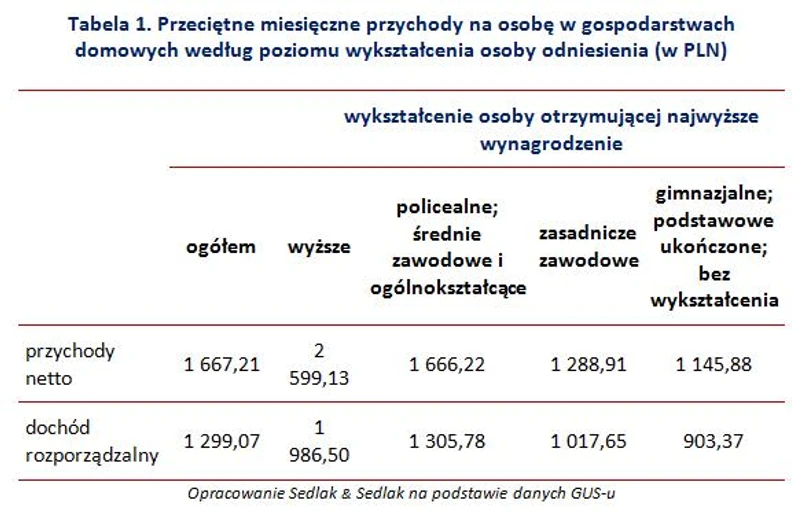 W gospodarstwach, gdzie osoba o najwyższych zarobkach miała wykształcenie wyższe, dochód rozporządzalny był niższy o ponad 600 PLN od przychodu. W przypadku osób najsłabiej wykształconych o niecałe 250 PLN. Oznacza to, że w gospodarstwach osób najwyżej wykształconych przeciętnie wyższe kwoty wpływały co miesiąc z dodatkowych przychodów.