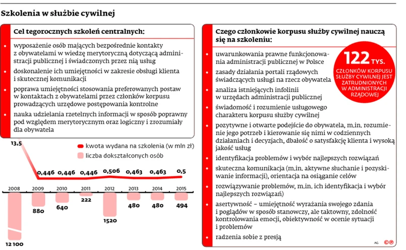 Inni członkowie nie są już tak powściągliwi. – Jeśli premier chce, aby jakość obsługi klienta była na wyższym poziomie, to powinna zadbać o odpowiednie środki na szkolenia. Jeszcze kilka lat temu na ten cel trafiało z budżetu kilkanaście milionów złotych – wskazuje Tadeusz Woźniak, członek Rady Służby Cywilnej. Dodaje, że w korpusie brakuje szkoleń, których potrzebują sami urzędnicy, co ogranicza im możliwości rozwoju.