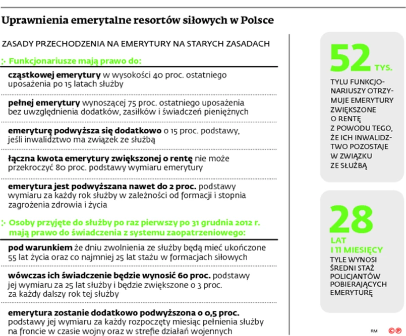 O ile w 2009 r. na przejście na emeryturę zdecydowało się 7,6 tys. funkcjonariuszy policji, straży pożarnej oraz Straży Granicznej, to już w 2013 r. liczba ta spadła do 6,7 tys. Jednak prawdziwa rewolucja nastąpiła w ubiegłym roku, kiedy na emeryturę zdecydowało się przejść zaledwie 3,8 tys. funkcjonariuszy. Przy czym największy spadek nastąpił w Państwowej Straży Pożarnej oraz w Straży Granicznej. W 2014 r. na zakończenie aktywności zawodowej zdecydowało się 865 strażaków, gdy rok wcześniej takich osób było 1,5 tys. Natomiast w przypadku pograniczników liczba chętnych do przejścia na emeryturę spadła z 998 osób w 2013 r. do 379 w 2014 r.