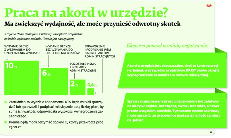 Ogólnie nie ma przeciwwskazań, żeby taki system był wprowadzony również w administracji w stosunku do zatrudnionych, których charakter pracy na to zezwala. Jeżeli zakres obowiązków pracowników obejmuje jedynie rozpatrywanie wniosków, to akordowy system wynagradzania należy uznać za dopuszczalny. Możliwe jest przecież dokładne wyliczenie, ile zatrudniony w danym miesiącu rozpatrzył wniosków czy przygotował pism, i na tej podstawie określenie jego poborów. Pewne wątpliwości może jednak budzić zastosowanie tego sytemu w stosunku do urzędników KRRiT. Zasady ich wynagradzania są bowiem określone w rozporządzeniu z 23 grudnia 2002 r. w sprawie zasad wynagradzania oraz wymogów kwalifikacyjnych pracowników Biura Krajowej Rady Radiofonii i Telewizji (Dz.U. nr 241, poz. 2075). Rozporządzenie to przypisuje do danych stanowisk wynagrodzenie określone w zasadniczej stawce miesięcznej. Zakładając jednak, że w KRRiT poprawnie określono normy pracy, których wykonanie gwarantuje otrzymanie co najmniej przypisanego do danego stanowiska wynagrodzenia zasadniczego, wprowadzenie pracy na akord nie stoi w sprzeczności z przepisami rozporządzenia.