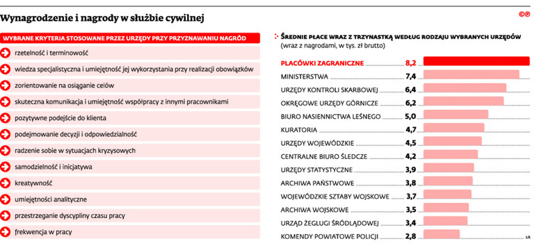 Z sondy DGP przeprowadzonej w ministerstwach i w urzędach wojewódzkich wynika, że tylko minister rolnictwa w tym roku nie zdecydował się na uruchomienie środków na nagrody. Tam jednak przeciętne wynagrodzenie jest jednym z najwyższych i wynosi 8 tys. zł brutto. W Warmińsko-Mazurskim Urzędzie Wojewódzkim najniższa nagroda w tym roku wyniosła 400 zł, a najwyższa 8 tys. zł. U wojewody mazowieckiego najniższa dodatkowa gratyfikacja to 100 zł, a najwyższa 6 tys. zł. U pomorskiego odpowiednio 100 zł i 5,4 tys. zł. Mniej szczodry był wojewoda lubelski, u którego najbardziej zasłużeni otrzymali po 2 tys. zł. Z kolei Urząd Wojewódzki w Białymstoku wypłacił nagrody od 125 zł do 4 tys. zł. Najniższy bonus u wojewody wielkopolskiego wyniósł 108 zł, a najwyższy 5 tys. zł. W dolnośląskim urzędzie średnia nagroda w tym roku wyniosła 3,6 tys. zł – instytucja nie chciała nam podać najniższych i najwyższych kwot.