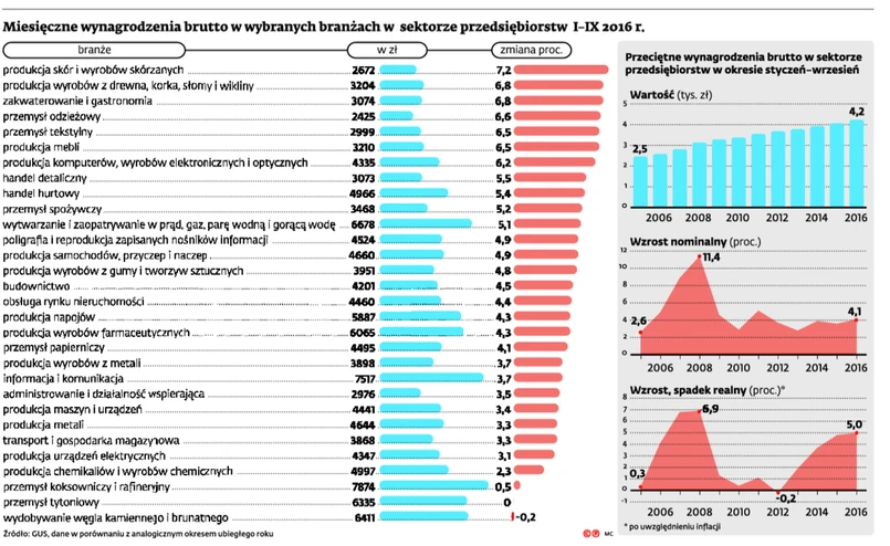 Przy tym wzrost zarobków w poszczególnych branżach był mocno zróżnicowany. Najbardziej (o 6,5–7,2 proc.) wzrosły one nominalnie w przemyśle skórzanym, w hotelarstwie i gastronomii, w przemyśle odzieżowym i tekstylnym oraz w produkcji mebli, a więc w branżach, w których nawet po podwyżkach płace nadal należą do najniższych.