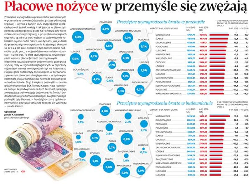 Płacowe nożyce w przemyśle się zwężają. Przeciętne wynagrodzenie pracowników zatrudnionych w przemyśle w 12 województwach są niższe od średniej krajowej - wynika z danych GUS.