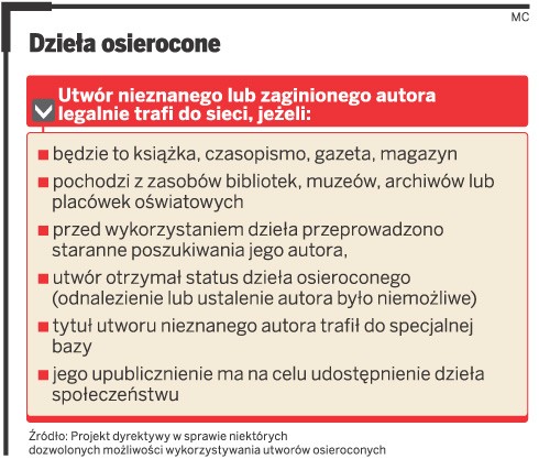 Unijna dyrektywa, której projekt został przedstawiony przez Komisję Europejską, ma rozwiać wątpliwości co do tego, kiedy i na jakich zasadach można rozpowszechniać dzieła, których autor jest nieznany, lub do którego trudno dotrzeć. Problem jednak w tym, że zakres dyrektywy jest zbyt wąski, m.in. dlatego że dotyczy publikowania takich utworów tylko w interencie.