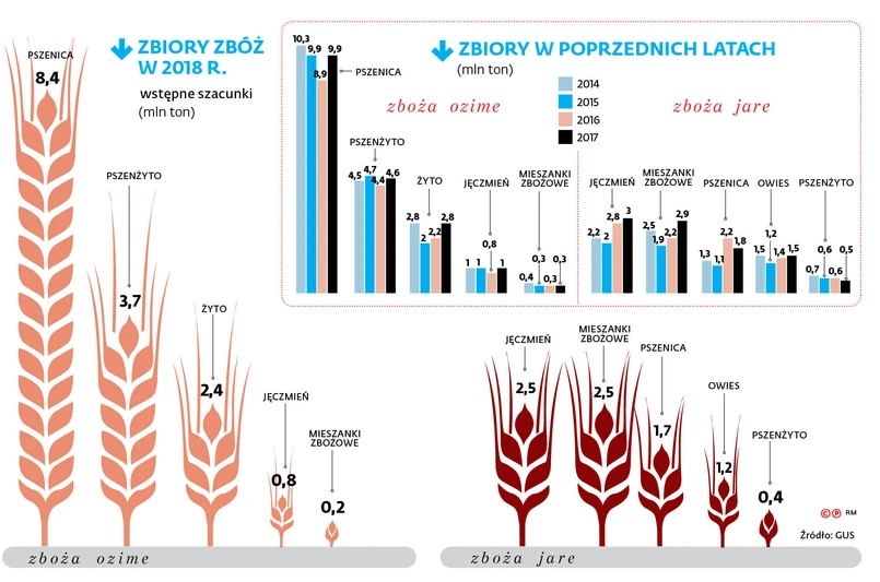 Na razie szacunki dotyczące tegorocznych zbiorów, które uwzględniają już problem braku wody, podał GUS. Wynika z nich, że największy spadek – aż o 35 proc. – będzie w przypadku pszenżyta zasianego wiosną tego roku. Jednak w skali zbiorów wszystkich zbóż to akurat nie odgrywa największej roli (rocznie rolnicy zbierają go nieco ponad 500 tys. t). Najważniejsza w strukturze produkcji jest pszenica ozima. Tu też zbiory będą mniejsze, bo wyniosą ok. 8,4 mln t, co jest wielkością o 16 proc. mniejszą od tej z 2017 r. Zauważalny spadek odnotują też ci, którzy pszenżyto zasiali jesienią. W ich przypadku żniwa będą gorsze o około jedną piątą.