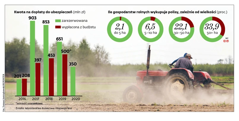 ubezpieczeń upraw rolnych i zwierząt gospodarskich w tym roku zarezerwowano w budżecie 350 mln zł, czyli o 300 mln zł mniej niż w 2019 r. Jego przedstawiciele tłumaczą jednak, że do tej pory nie wykorzystywano w pełni zarezerwowanej kwoty. W 2018 r. z 853 mln zł na dopłaty poszły 453 mln, a w ubiegłym roku z zaplanowanych 651 mln wydano ok. 500 mln.