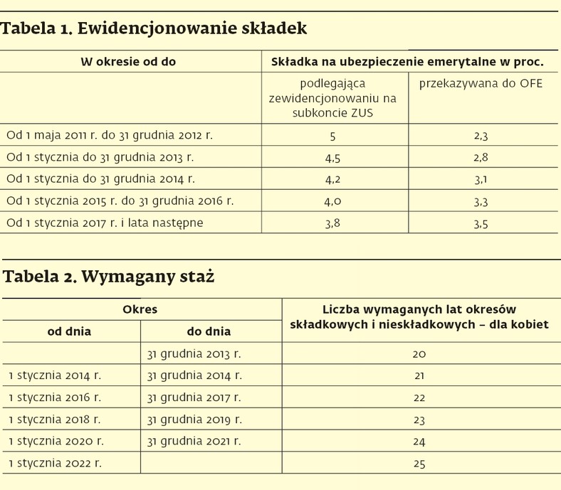 Kwota składek na ubezpieczenie emerytalne za okresy ubezpieczenia przypadające po 31 grudnia 1998 r. stanowi 19,52 proc. podstawy wymiaru składek. W przypadku gdy osoba jest członkiem otwartego funduszu emerytalnego, składka emerytalna ewidencjonowana na koncie ubezpieczonego wynosi 12,22 proc. tej podstawy, z tym że za okresy podlegania ubezpieczeniom emerytalnemu i rentowym, począwszy od 1 maja 2011 r. – dodatkowo na subkoncie w ZUS. [tabela 1]