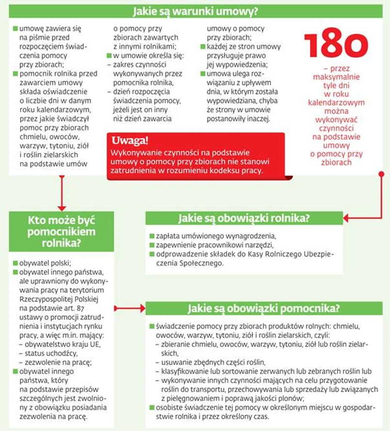 Od tego dnia obowiązująca nowelizacja ustawy o ubezpieczeniu społecznym rolników wprowadziła do systemu prawnego umowę o pomocy przy zbiorach jako nowy rodzaj umowy. Jest ona przeznaczona dla rolników, którzy chcą zatrudnić na krótki czas pomocników bez zbędnych formalności. Z nowych przepisów nie będą mogli skorzystać wszyscy rolnicy, ale tylko ci uprawiający określone w ustawie kategorie roślin. Możliwości okazjonalnego zatrudnienia pomocnika nieobjętego powszechnym ubezpieczeniem społecznym nie będą mieli chociażby producenci mleka. Nowe rozwiązania mają w założeniu zapewnić ochronę osobom już pracującym dorywczo, ale najczęściej bez żadnych umów. Pojawiły się już jednak głosy krytyczne, że nowe przepisy nie zapewniają nawet minimum ochrony. Ustawa nie wprowadza bowiem ani stawki minimalnej, ani dozwolonego dobowego wymiaru czasu pracy dla pomocników oraz, co trzeba podkreślić, nie objęła ich ubezpieczeniem emerytalno-rentowym.