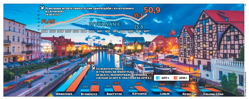 I tak np. Bydgoszcz zamierza wydać w 2018 r. aż 717 mln zł. Dla porównania, w ubiegłym roku na inwestycje przeznaczono 260 mln zł, a w 2016 r. – jedynie 180 mln. Gdańsk planuje wydatki na poziomie 676 mln zł. Przy czym ubiegłoroczny plan opiewał na sumę 450 mln zł. Spore wzrosty zaplanowały też władze Katowic. W tym roku inwestycje miejskie pochłoną 646 mln zł, podczas gdy w 2017 r. było to zaledwie 190 mln, a rok wcześniej – 139 mln zł. Więcej zamierzają wydać także władze Warszawy. W 2017 r. inwestycje w stolicy pochłonęły 2,9 mld zł, a tegoroczny plan zakłada przekroczenie poziomu 3,1 mld zł.