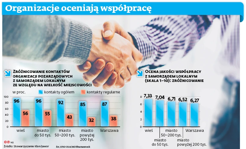 samorząd lokalny jest ważnym partnerem. Niemal wszystkie stowarzyszenia i fundacje przynajmniej od czasu do czasu mają kontakt z przedstawicielami lokalnych władz, mniej więcej co druga organizacja kontaktuje się z nimi często i regularnie. Relacje te są szczególnie ważne w mniejszych ośrodkach. Dla organizacji z terenów wiejskich lub mniejszych miejscowości realizacja zadań publicznych na zlecenie samorządu stanowi jeden z podstawowych sposobów pozyskania środków finansowych na działalność. Jednak środki samorządowe są istotnym źródłem finansowania działań organizacji pozarządowych niezależnie od miejsca działania. W całym kraju korzysta z nich rokrocznie mniej więcej połowa organizacji, a w całym budżecie sektora pozarządowego stanowią one ok. 15 proc. – mówi Marta Gumkowska, koordynatorka Programu Badania Stowarzyszenia Klon/Jawor.