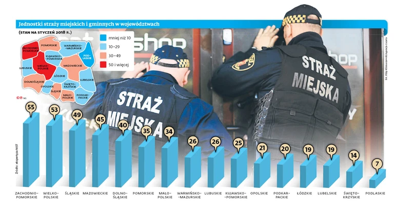 Ewentualne zwiększenie kompetencji straży miejskich nie wszędzie byłoby odczuwalne. Bo nie wszystkie gminy mają takie formacje, zresztą w ostatnich latach była raczej tendencja do ich rozwiązywania niż powoływania. O ile w 2012 r. było niemal 600 straży w gminach, o tyle na koniec 2017 r. – 490, a więc tylko w co piątej gminie (z reguły w każdym dużym mieście).