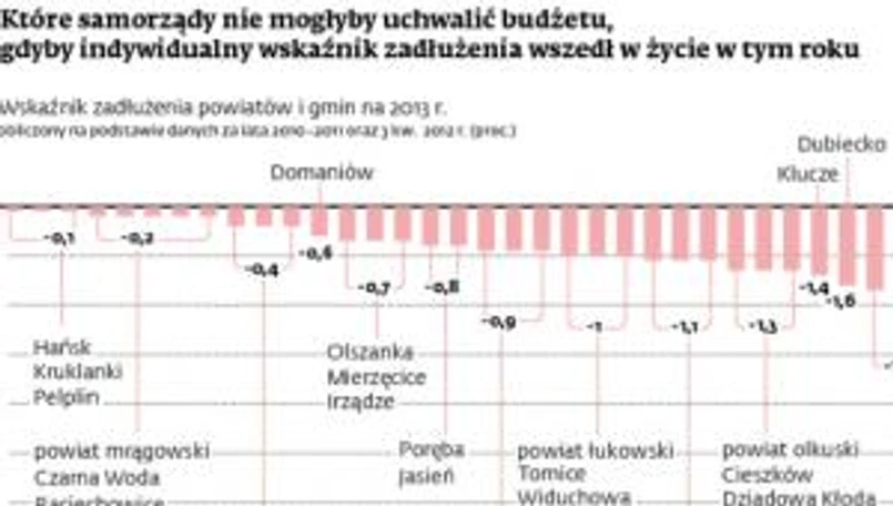 40 gmin i osiem powiatów nie mogłoby uchwalić budżetów, gdyby nowy wskaźnik zadłużenia obowiązywał w 2013 r. – wynika z danych Ministerstwa Administracji i Cyfryzacji. Resort Michała Boniego na bazie danych regionalnych izb obrachunkowych sporządził listę samorządów, które w przyszłym roku mogą się znaleźć na skraju bankructwa. Nie będą mogły zaciągać kolejnych długów (by realizować inwestycje) ani nawet uchwalić budżetów na kolejny rok. To oznacza zarząd komisaryczny.