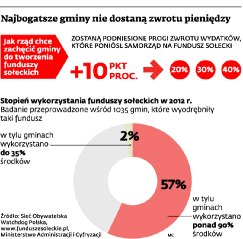 Rząd chce bowiem uzależnić zwrot pieniędzy gminom od tego, czy przekraczają one o 200 proc. lub więcej średnią kwotę bazową dla kraju (ustalaną na podstawie dochodów gmin wiejskich i miejsko-wiejskich oraz liczby ich mieszkańców).
