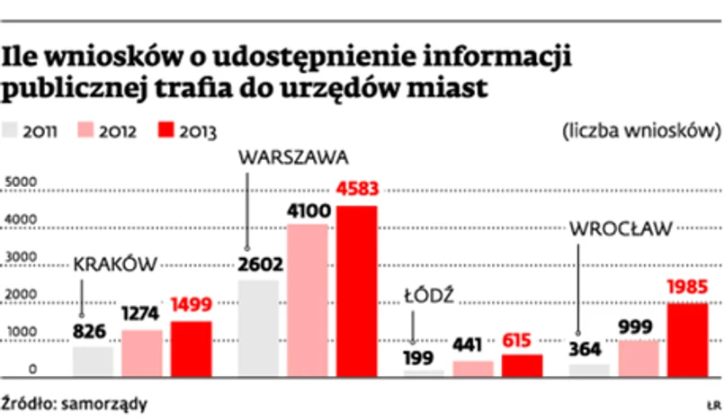 Głównym argumentem samorządowców jest to, że z roku na rok wręcz lawinowo rośnie liczba wniosków o udostępnienie informacji. Potwierdzają to dane, jakie uzyskaliśmy z największych miast. Do warszawskiego ratusza w ubiegłym roku wpłynęło niemal 4,6 tys. wniosków, podczas gdy jeszcze w 2010 r. złożono ich tylko ok. 2,2 tys. Wrocław w 2013 r. otrzymał niemal 2 tys. wniosków. To pięciokrotnie więcej niż w 2010 r. (382 wnioski).