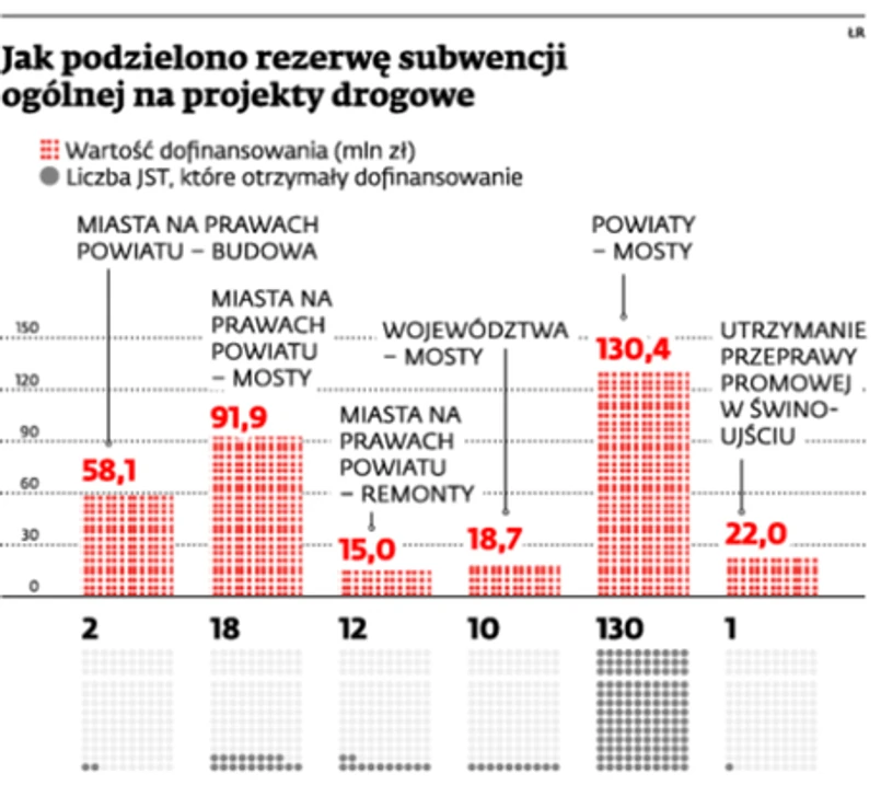 Właśnie trwa szczyt sezonu na ten rodzaj wsparcia. W ubiegłym tygodniu rząd i samorządy ostatecznie podzieliły rezerwę subwencji ogólnej na projekty drogowe w wysokości 313 mln zł (ustanowioną na podstawie art. 26 ust. 1 ustawy z 13 listopada 2003 r. o dochodach jednostek samorządu terytorialnego, Dz.U. z 2010 r. nr 80, poz. 526 ze zm.).
