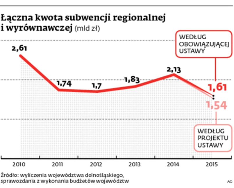 Jak mówi Weronika Skwarzec z biura prasowego Urzędu Marszałkowskiego Województwa Warmińsko–Mazurskiego, w 2015 r. dochody z subwencji wyrównawczej i regionalnej zmniejszą się o ponad 42 mln zł w stosunku do wyliczonych na podstawie obecnych przepisów. W świętokrzyskim spadek z obu subwencji wyniesie ok. 18 mln zł, w lubuskim – 22 mln zł, a w podkarpackim – ponad 40 mln zł.