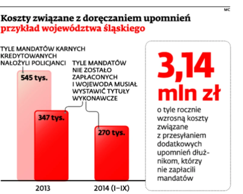 To kolejny przykład zadania, na które rząd nie przekazał wystarczających środków. Urzędy, które muszą ściągać niezapłacone mandaty, narzekają, że zostały obciążone nowym obowiązkiem. Nie dostały jednak wystarczających środków na pokrycie kosztów związanych z upomnieniami dla piratów drogowych.