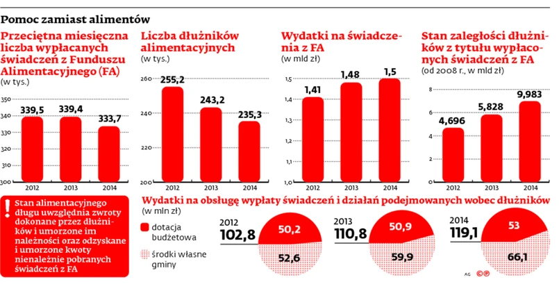 Statystyki resortu pracy wskazują, że w ubiegłym roku gminy podjęły prawie 409 tys. działań wobec osób niepłacących na dzieci. Spośród nich najwięcej dotyczyło przekazywania komornikom danych uzyskiwanych w ramach wywiadów alimentacyjnych i pochodzących ze składanych oświadczeń majątkowych. W 2014 r. było ich 79,1 tys.