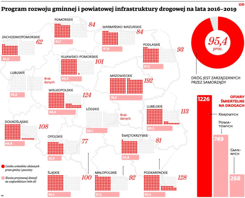 DGP sprawdził, ile samorządów w tym roku ubiegało się o pieniądze. – W przypadku naszego województwa zainteresowanie programem jest na podobnym poziomie jak w latach ubiegłych – informuje Tomasz Stube, rzecznik prasowy w Wielkopolskim Urzędzie Wojewódzkim w Poznaniu. I wylicza, że w tym roku wpłynęły 124 wnioski (41 dotyczy dróg powiatowych, 83 – gminnych). Z kolei w ubiegłym roku do wojewody wielkopolskiego samorządy złożyły ich 108 (60 dotyczyło dróg gminnych, a 48 – powiatowych).