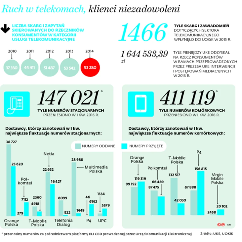Lista zawiera więcej takich dialogów. – Miałem dość, czułem się brudny moralnie – przyznaje telemarketer. Jak opowiada, nieuczciwe praktyki dotykały głównie starszych osób z mniejszych miejscowości. Ale zarówno PGT, jak i jego bezpośredni pracodawca (firma call center, z którą współpracowała PGT) wszystkiemu zaprzeczają. W oświadczeniu operator wytyka UOKiK nieprawdę i twierdzi, że to efekt ataków konkurencji, która boi się utraty klientów. „Atrakcyjność naszej oferty doceniło już 15 tys. zadowolonych użytkowników” – zapewnia firma. Tylko w pierwszym kwartale 2016 r. PGT przejęła 1686 numerów stacjonarnych. W tym czasie Orange, który nadal kontroluje ponad połowę rynku telefonii stacjonarnej, stracił 39 tys. numerów. Pracodawca pytany o cytowanego telemarketera stwierdził, że to zemsta za zwolnienie i jego słowa nie mają pokrycia w rzeczywistości. Ale nie chciał wystąpić pod nazwiskiem.