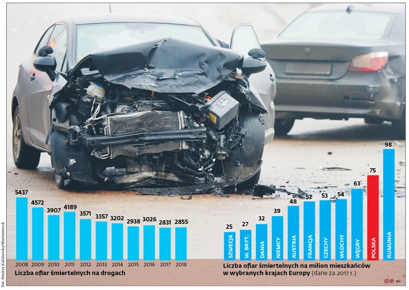 Choć jest lepiej niż przed dekadą, gdy na drogach ginęło prawie 5,5 tys. osób rocznie, to w ostatnich czterech latach niemal stoimy w miejscu, bo nie udało się utrzymać trendu spadkowego. Na dodatek zeszły rok był drugim po 2016 r., w którym liczba zabitych wzrosła. W efekcie pod tym względem jesteśmy jednym z najbardziej niebezpiecznych krajów w Unii Europejskiej. Rocznie ginie nad Wisłą 75 osób ma milion mieszkańców. Gorzej jest tylko w Bułgarii,