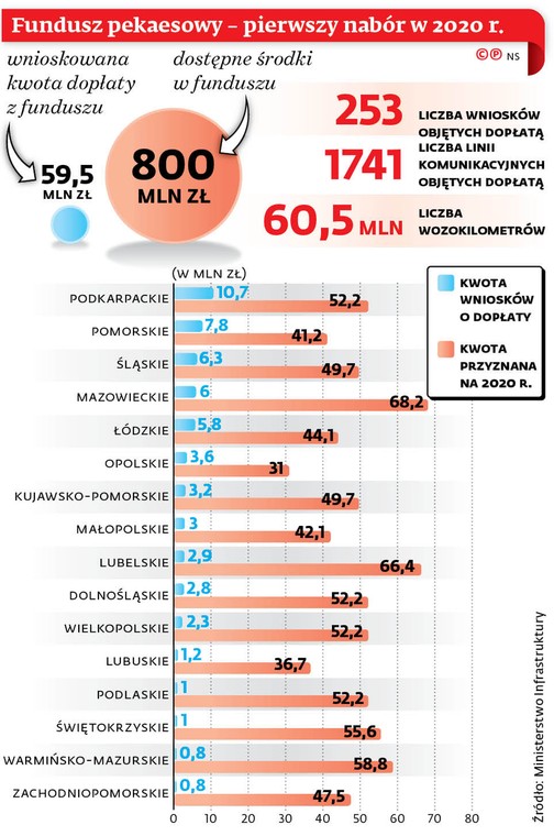 Pieniądze są. W ubiegłym roku samorządy w skali kraju sięgnęły po nieco ponad 17 mln zł z przewidzianej puli 300 mln zł w Funduszu Rozwoju Przewozów Autobusowych. I chociaż po pierwszym naborze w tym roku widać, że zainteresowanie jest większe niż w roku poprzednim, to na razie złożono wnioski na kwotę 59,5 mln zł. Pula na ten rok to 800 mln zł.