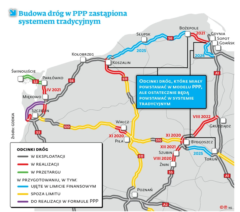 Tymczasem jeszcze przed dwoma laty rząd zapowiadał, że będzie to pierwszy odcinek zrealizowany w systemie PPP. Jak dotąd budowa inwestycji w tym modelu nie ma u nas szczęścia. Pojedyncze projekty zlecają samorządy. Oprócz obwodnicy Trójmiasta w PPP miały powstać jeszcze odcinki trasy S6 od Koszalina w stronę Gdyni, a także obiecywana od wielu lat ekspresowa trasa S10 z Bydgoszczy do Torunia. Prywatne firmy miały ze swoich środków lub kredytów zaprojektować i wybudować drogę, a następnie utrzymywać ją przez określony czas. W zamian strona publiczna przekazywałaby w tym okresie firmie tzw. opłatę za dostępność.