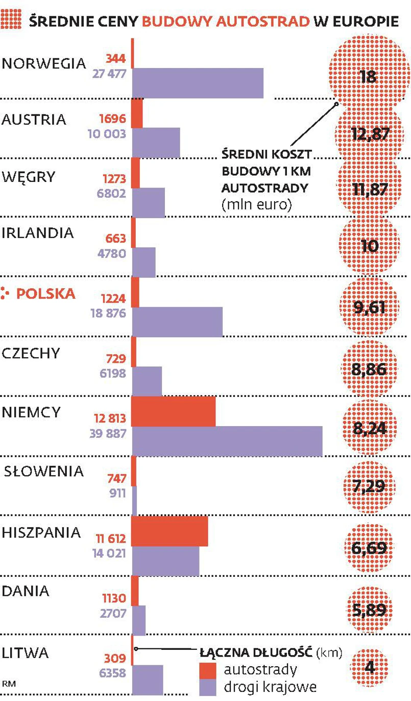 Generalna Dyrekcja Dróg Krajowych i Autostrad, rządowa agencja do stworzenia siatki szybkich tras, uważa, że tłumaczenia firm to zasłona dymna, i podaje, że średni koszt budowy jednego kilometra autostrady w Polsce – 9,6 mln euro – nie odbiega znacząco od stawek w innych krajach. Średnia w Unii Europejskiej to 10 mln euro za kilometr. Taniej niż w Polsce buduje się m.in. w Niemczech, Hiszpanii, Danii, Czechach i na Litwie. Drożej niż w Polsce jest tylko w krajach górzystych – np. Austrii i Norwegii.