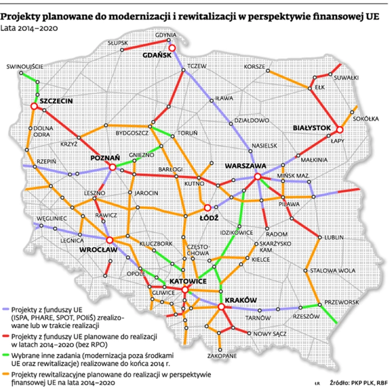 Spółka PKP Polskie Linie Kolejowe w pośpiechu próbuje wydać unijne dotacje z lat 2007–2013, z których trzeba się rozliczyć do 2015 r. Z puli 20 mld zł zagrożonych jest nadal od 4 do 5 mld zł. Jednocześnie trwa przygotowywanie projektów z myślą o nowym budżecie UE, w ramach którego kolej spodziewa się ponad 25 mld zł dofinansowania. Dotacje trzeba będzie wydać do 2022 r., co oznacza dla pasażerów niemal 10 lat utrudnień na torach, a dla spółek budowlanych – lawinę kontraktów.