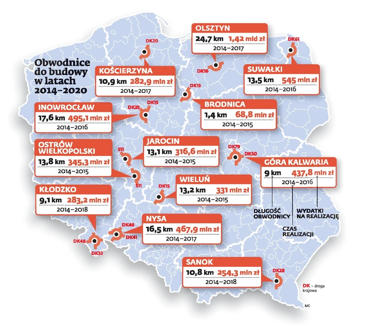 Na nowej liście znalazły się obwodnice o łącznej długości 140 km. Będzie ich 11. Najdroższa będzie 25-kilometrowa droga w pobliżu Olsztyna, która pochłonie 1,4 mld zł. Po prawie pół miliarda trzeba będzie wydać na arterie wokół Inowrocławia, Nysy i Góry Kalwarii.
