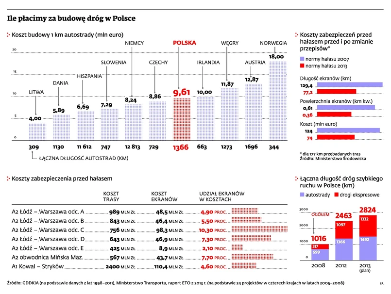 Co najbardziej nabija koszty? Wykup gruntów, który zazwyczaj obejmuje też rezerwowy pas ziemi pod dodatkową jezdnię. Druga rzecz to ceny materiałów, np. betonu. Stawki za asfalt dyktują Orlen i Lotos – w czasie boomu przed Euro 2012 zostały wywindowane o 40 proc. w ciągu roku. Ostro przepłacamy za ekrany akustyczne. Według wyliczeń Ministerstwa Środowiska przy drogach wybudowanych od 2007 r. mogłoby ich być aż o 40 proc. mniej bez uszczerbku dla ludzi i środowiska. Za przepłacone 2 mld zł można by zbudować 45 km autostrady.