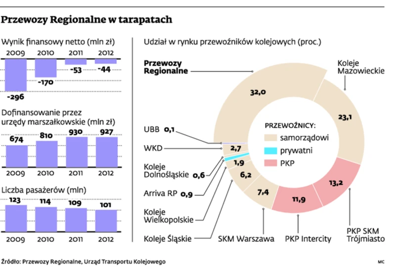 Przewozy Regionalne, które przewożą 100 mln pasażerów rocznie, to kolos na glinianych nogach. Przejęcie pod koniec 2008 r. Przewozów od PKP przez samorządy wojewódzkie okazało się słabym interesem. Przewoźnik od lat przynosi straty, z każdym rokiem ubywa pasażerów i pogarsza się jakość usług.